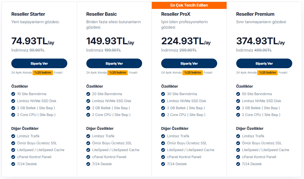 | Reseller Starter | 10 Site | 74.93 TL | Yeni başlayanlar için ideal |