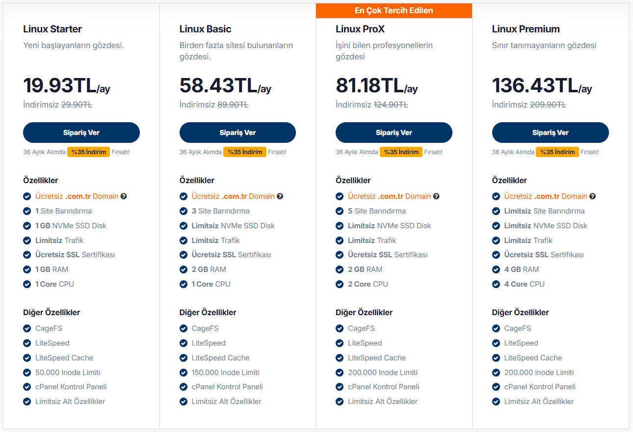- Linux Basic: Birden fazla sitesini barındırmak isteyenler için ideal.