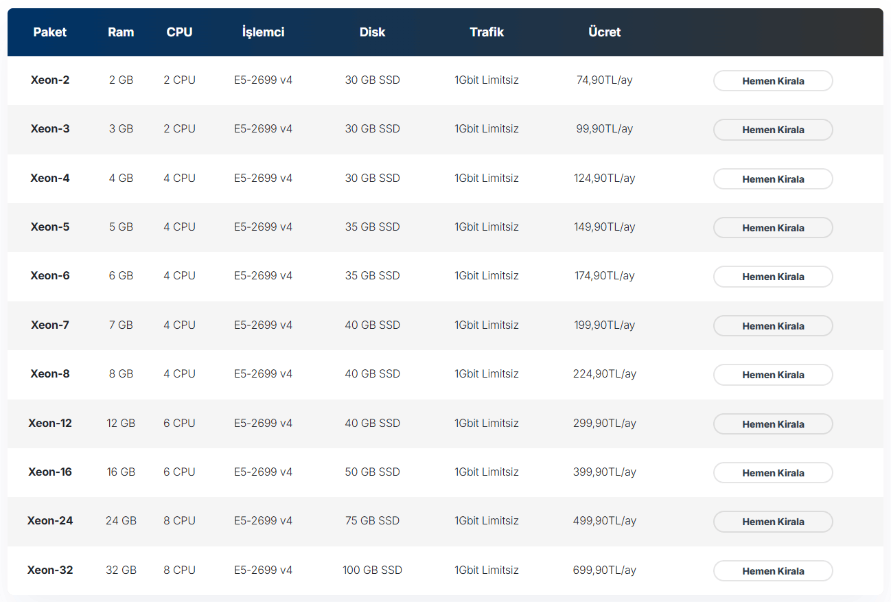 | Xeon-2 | 2 GB | 2 CPU | 30 GB SSD | 74,90 TL |